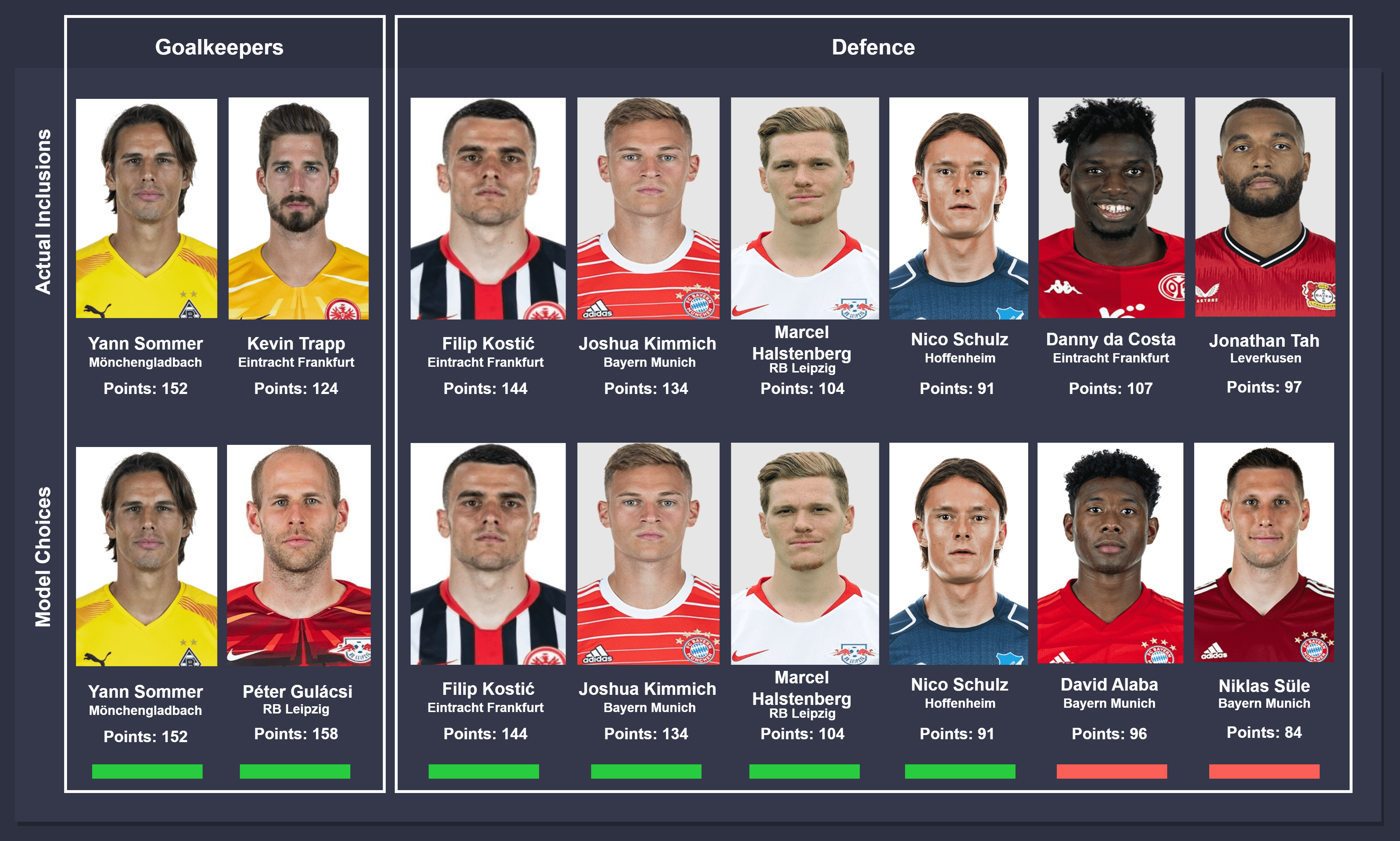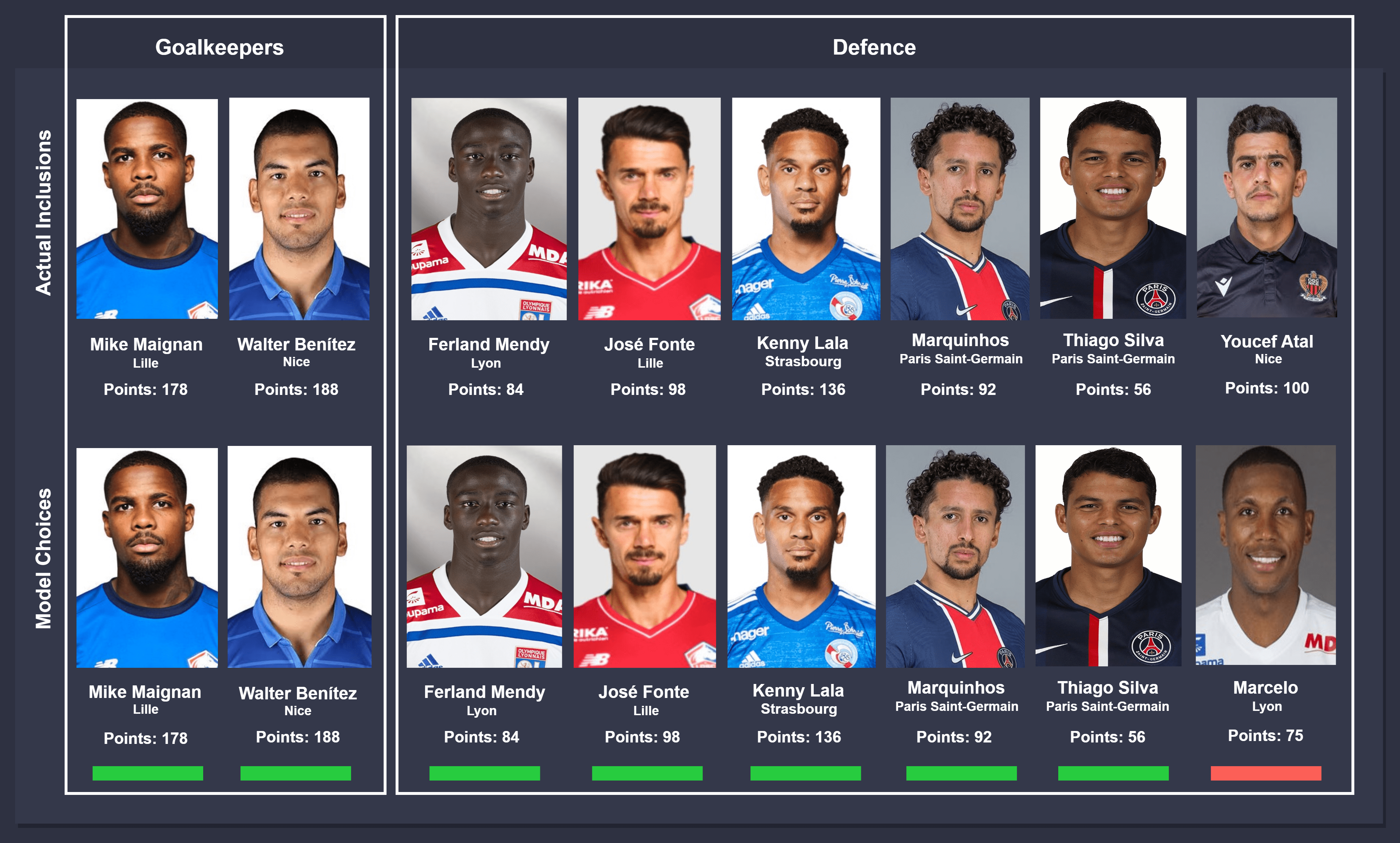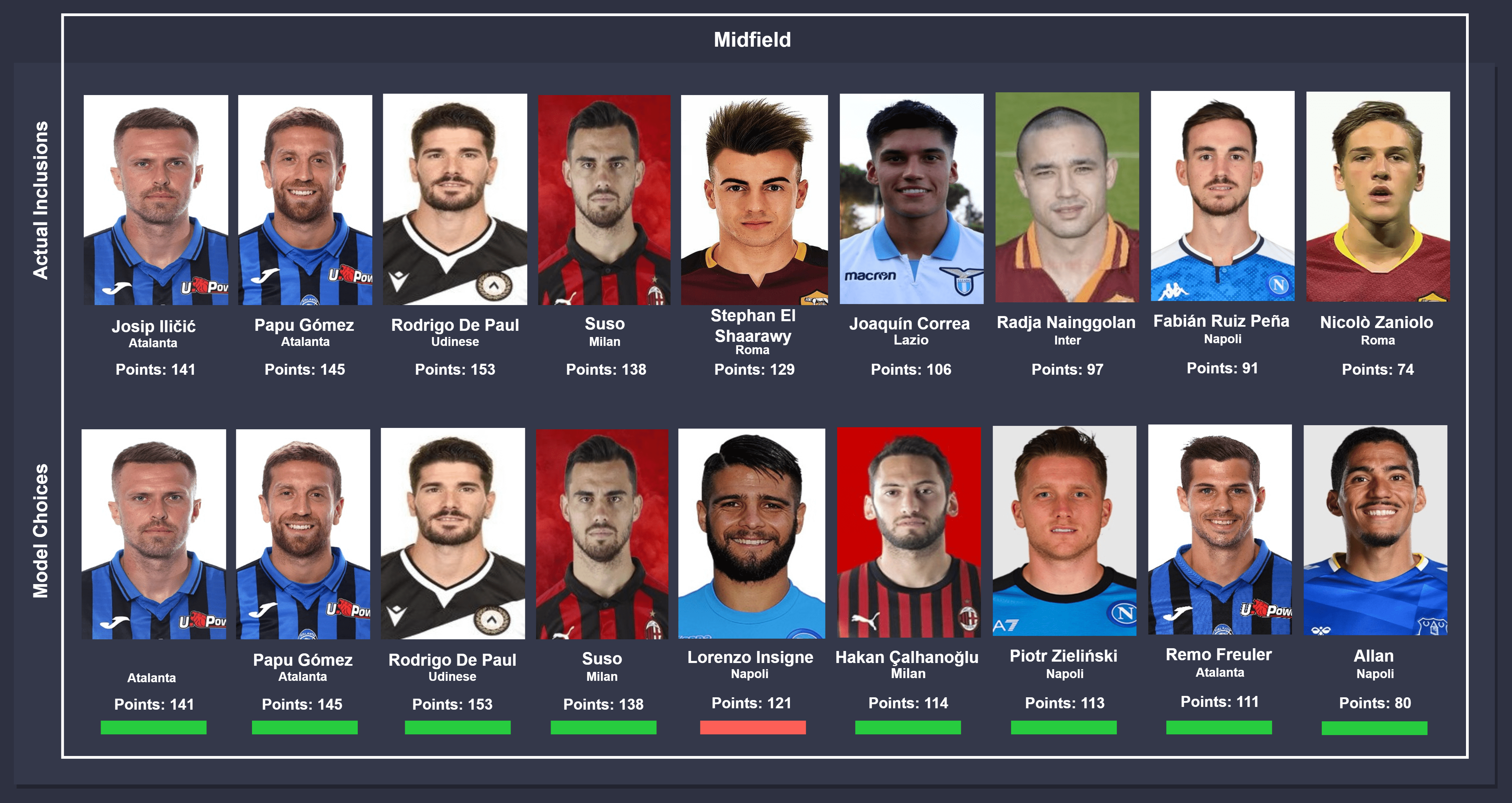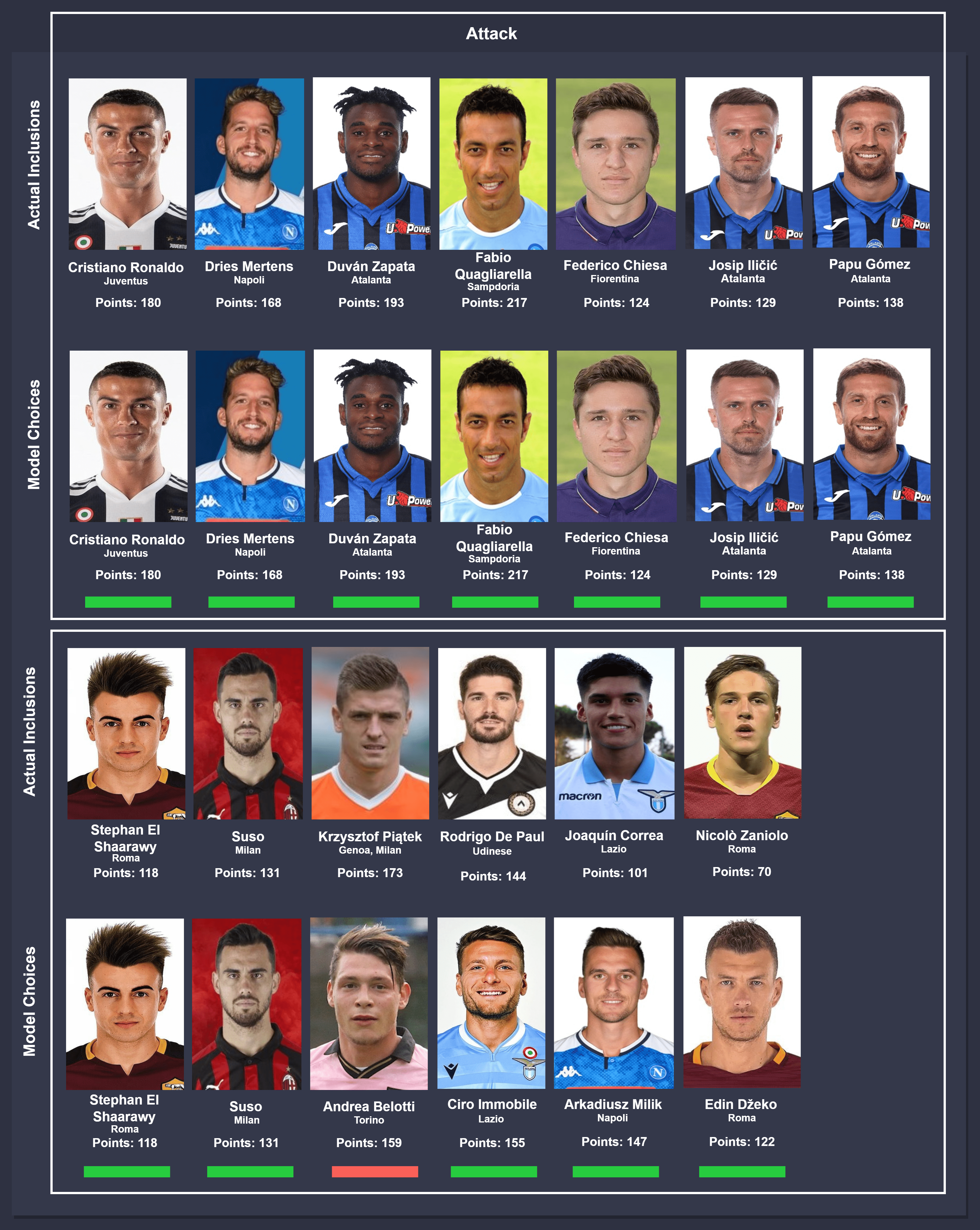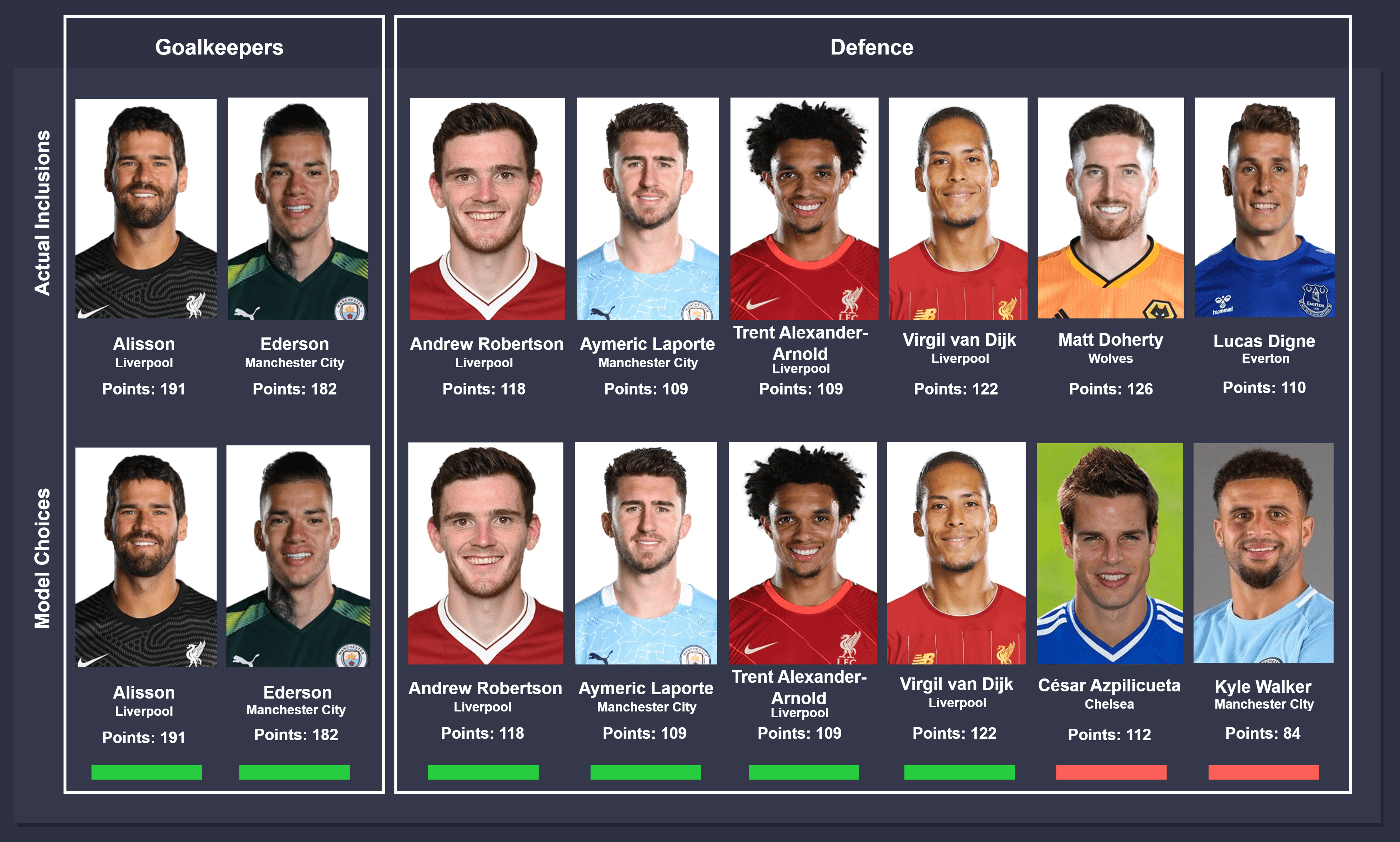 Comparison takes place between actual inclusions (top) and model choices (bottom), from left to right. In instances where different players were chosen by the model, the players were ordered on the descending order of points accumulated for consistency. The key below can be used to identify the status of the comparison.