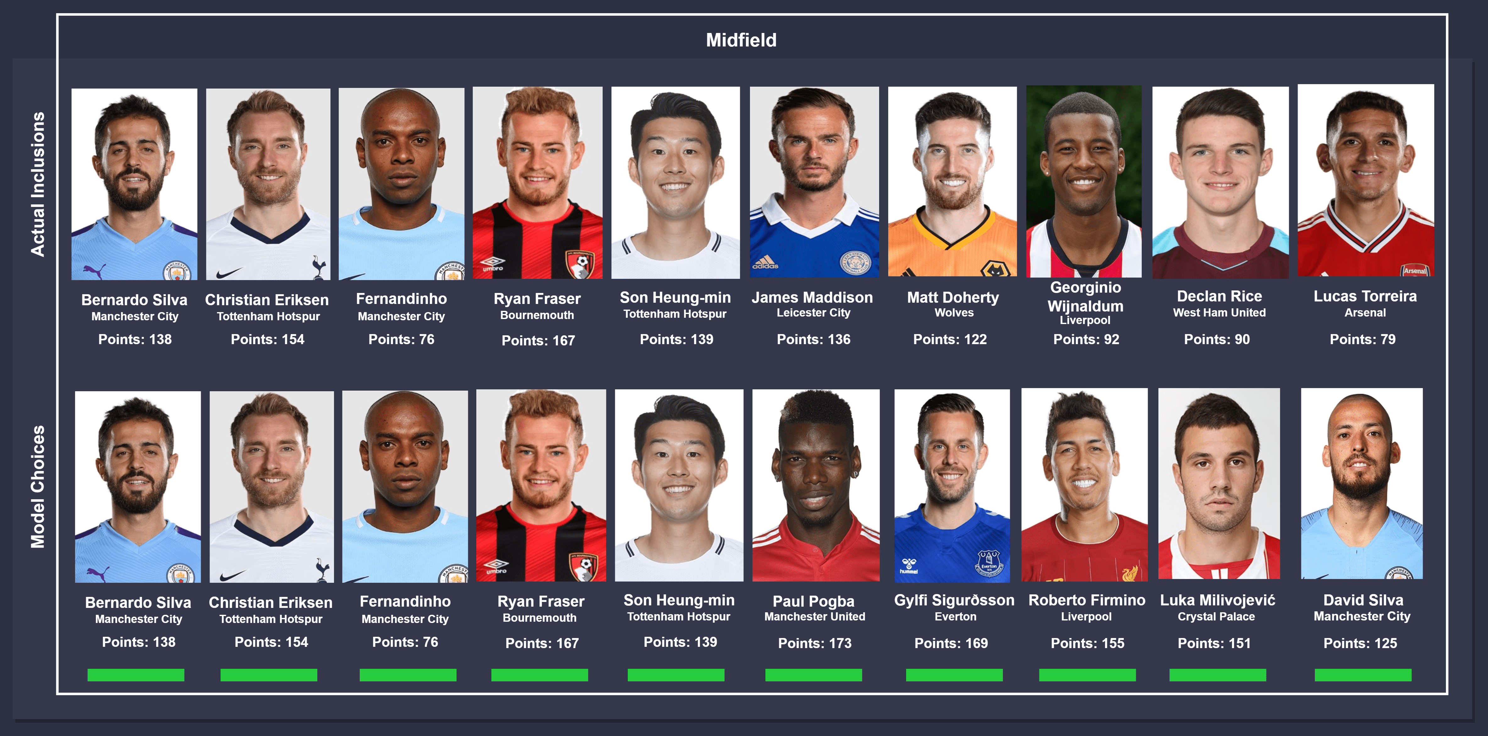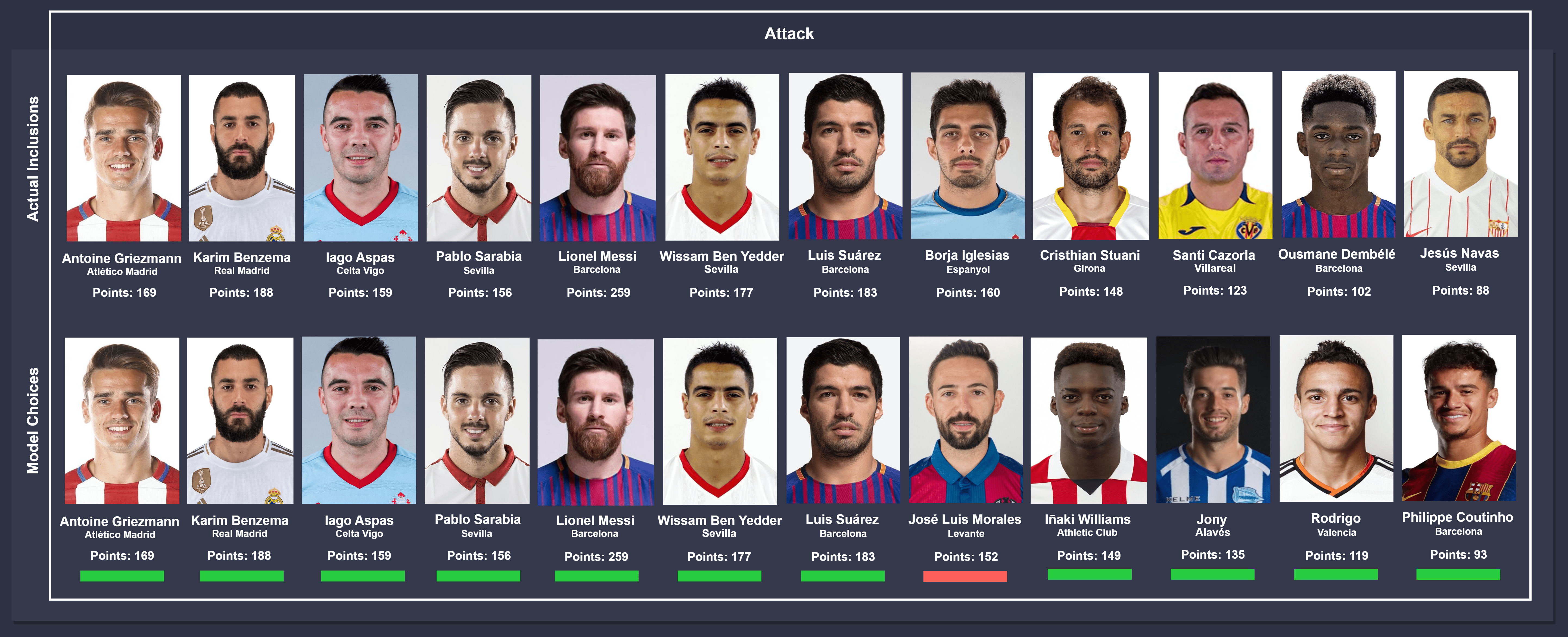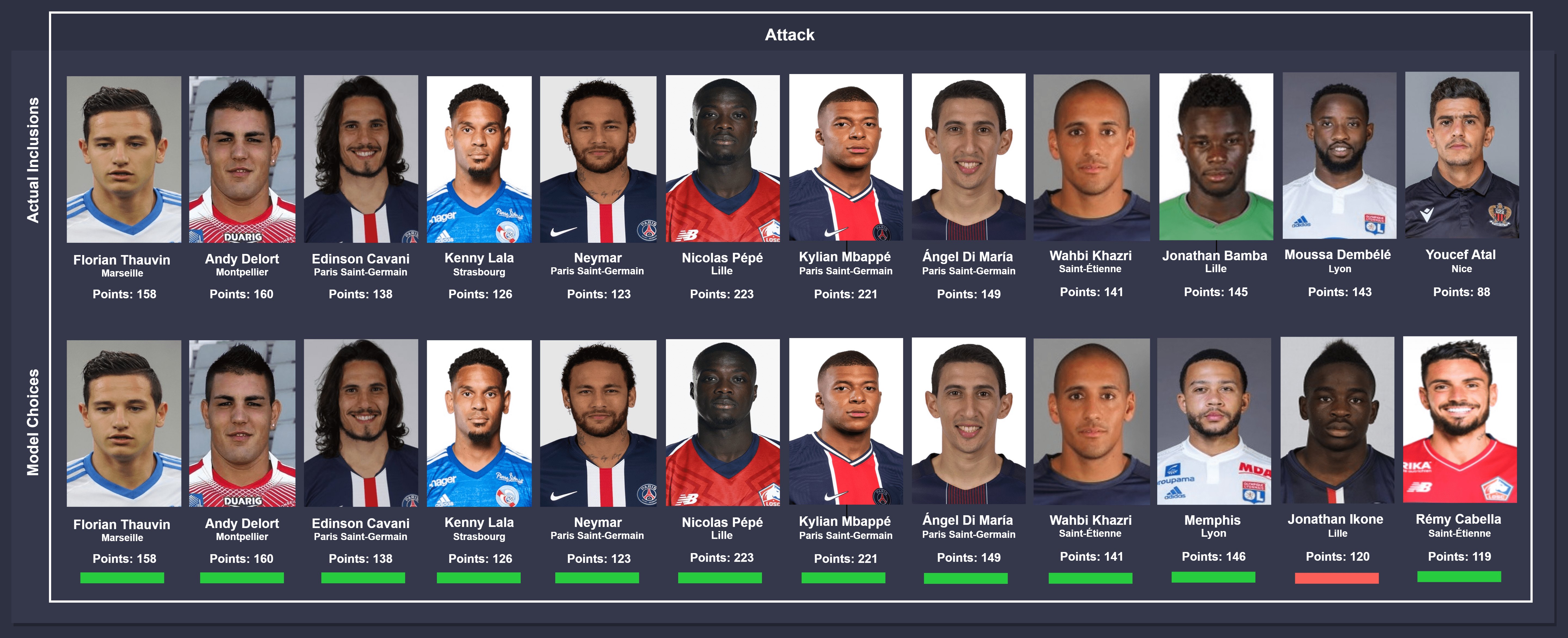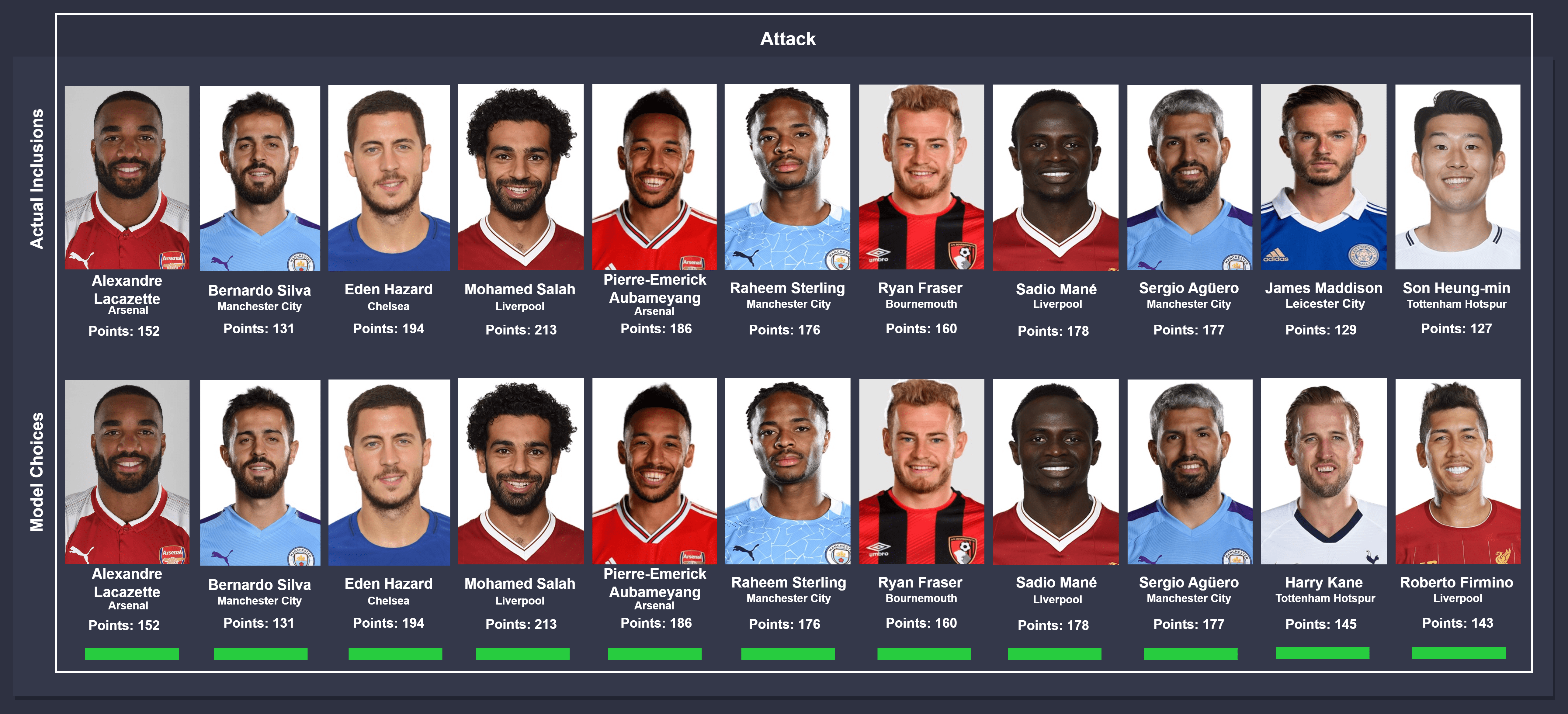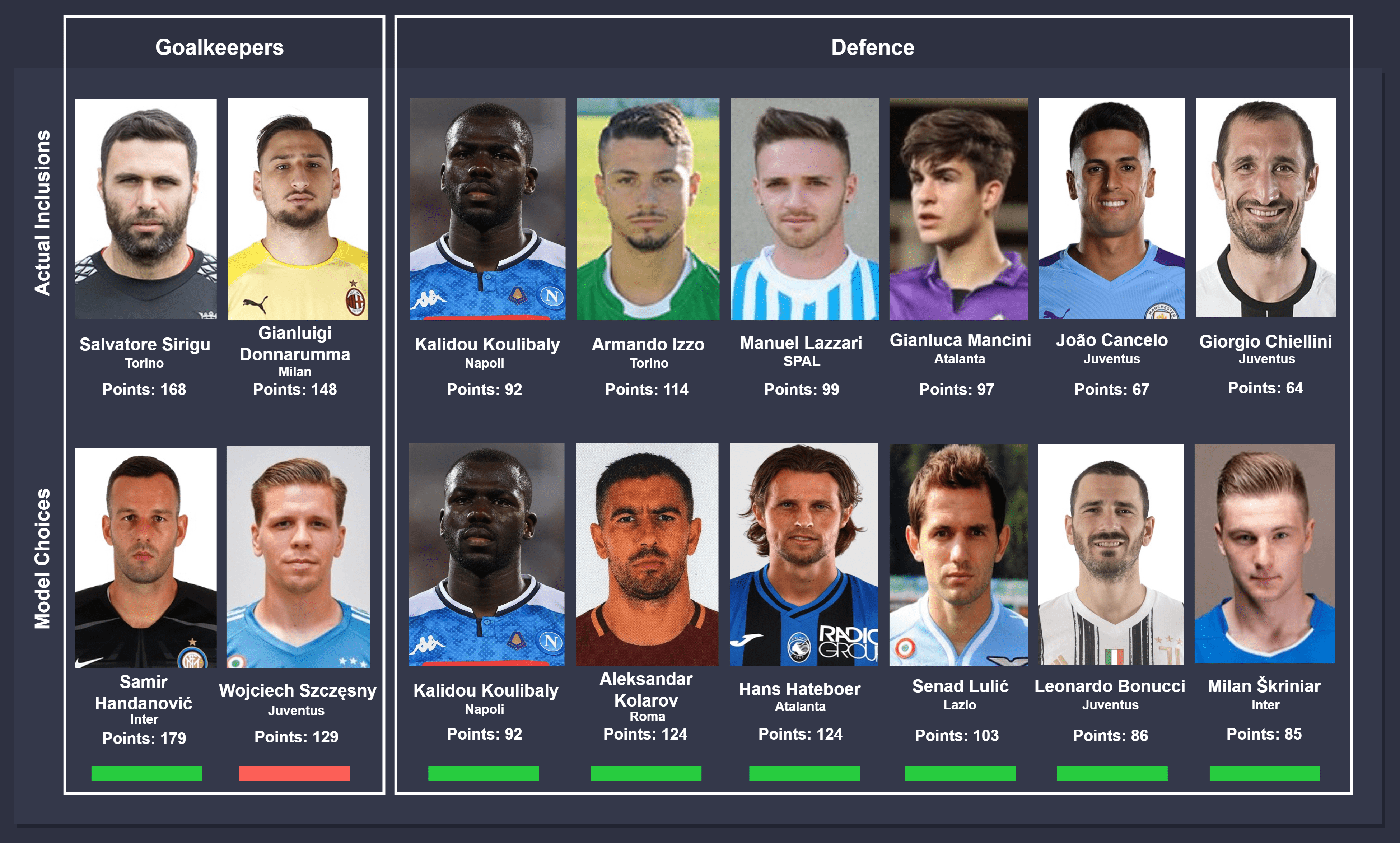 Comparison takes place between actual inclusions (top) and model choices (bottom), from left to right. In instances where different players were chosen by the model, the players were ordered on the descending order of points accumulated for consistency. The key below can be used to identify the status of the comparison.