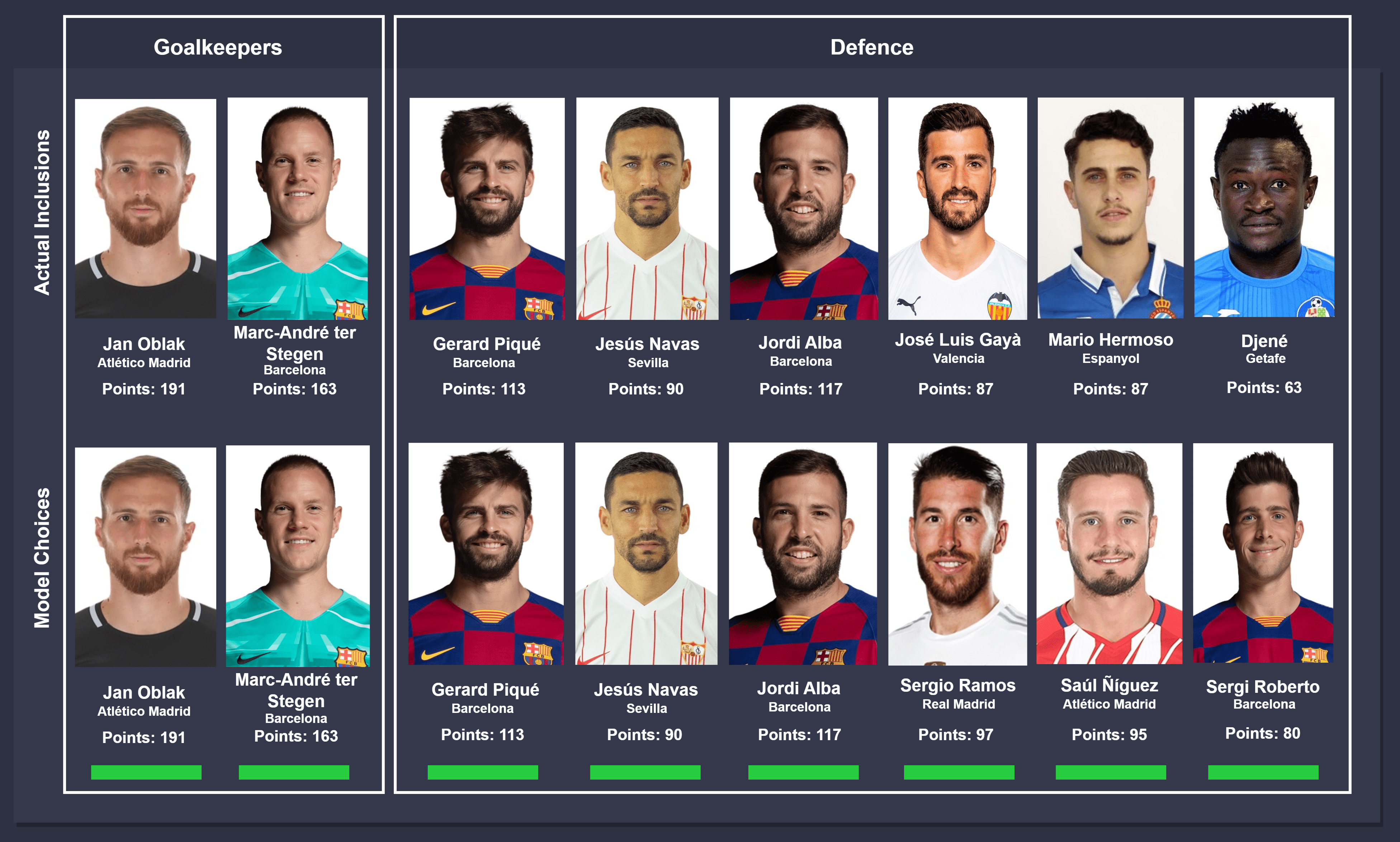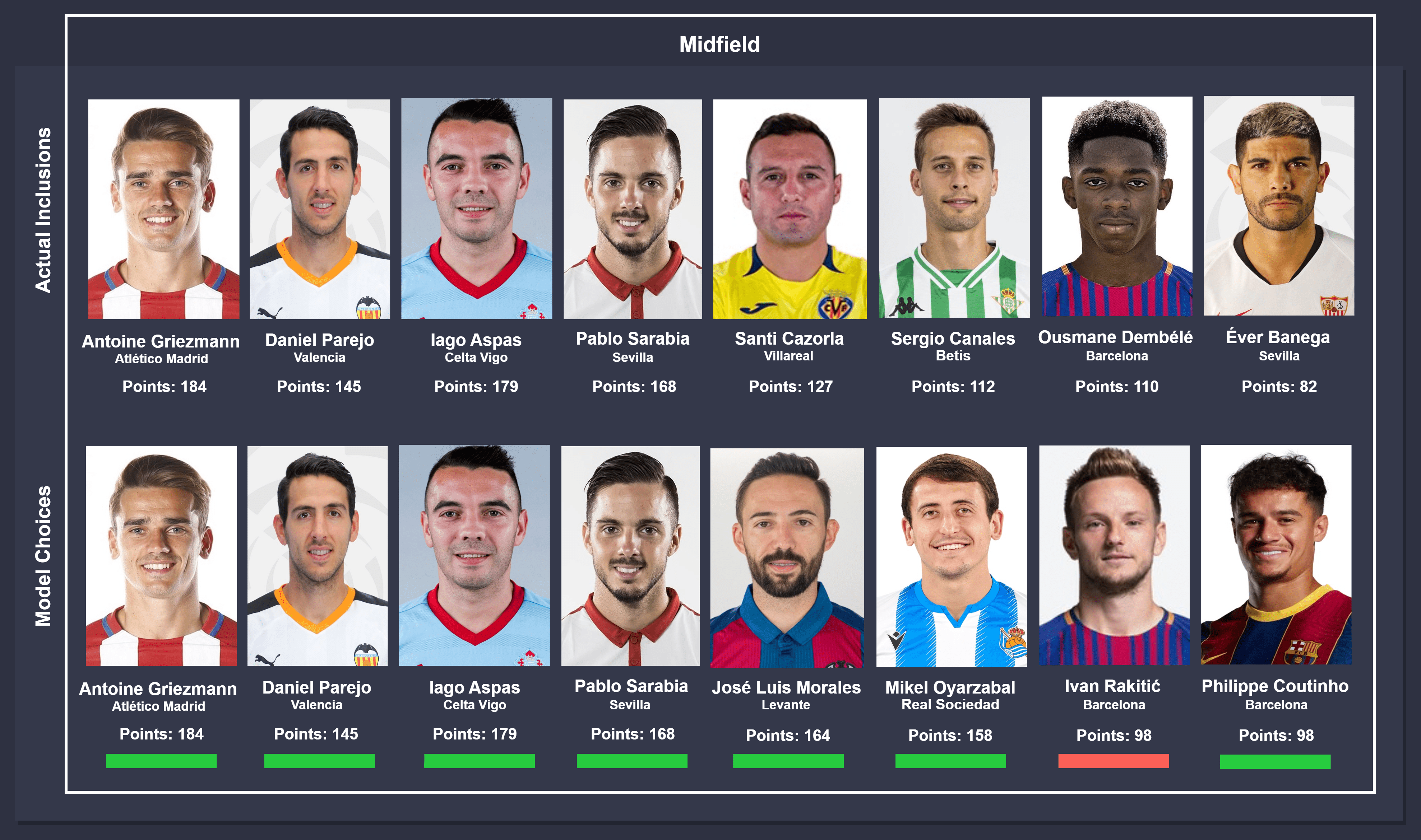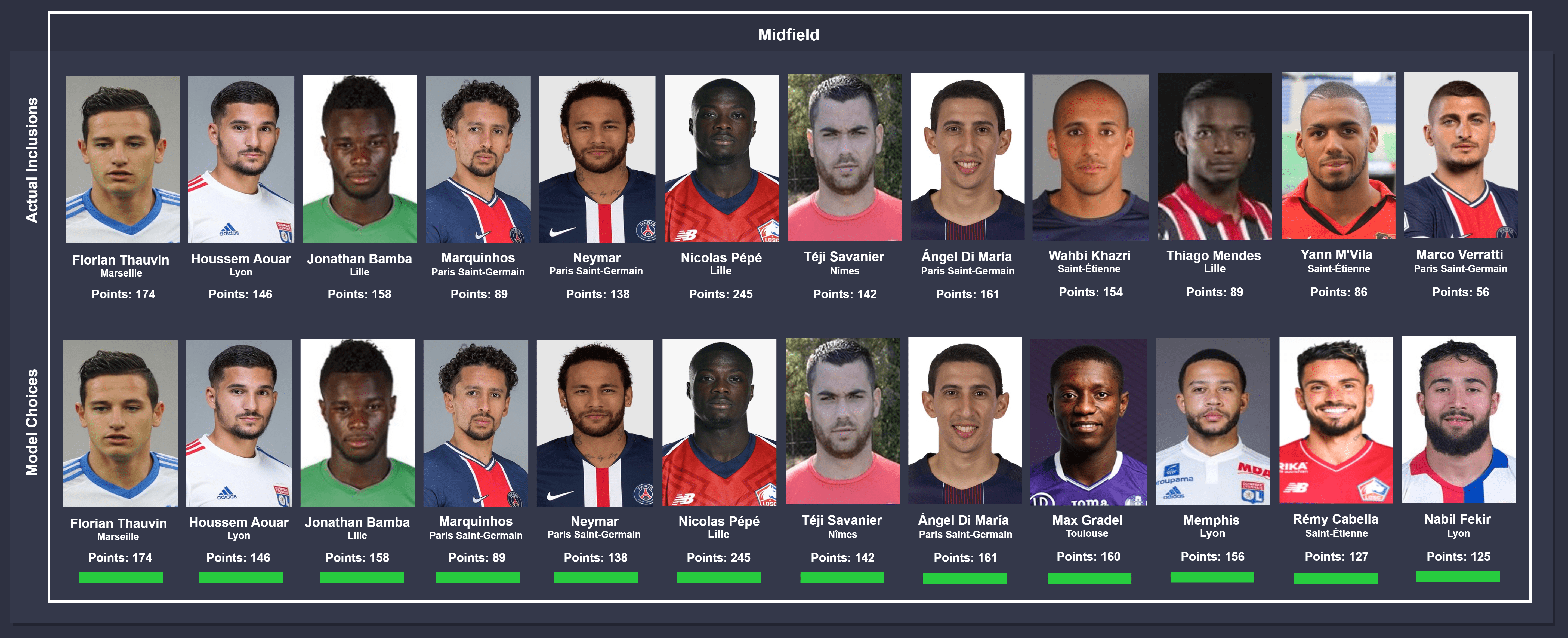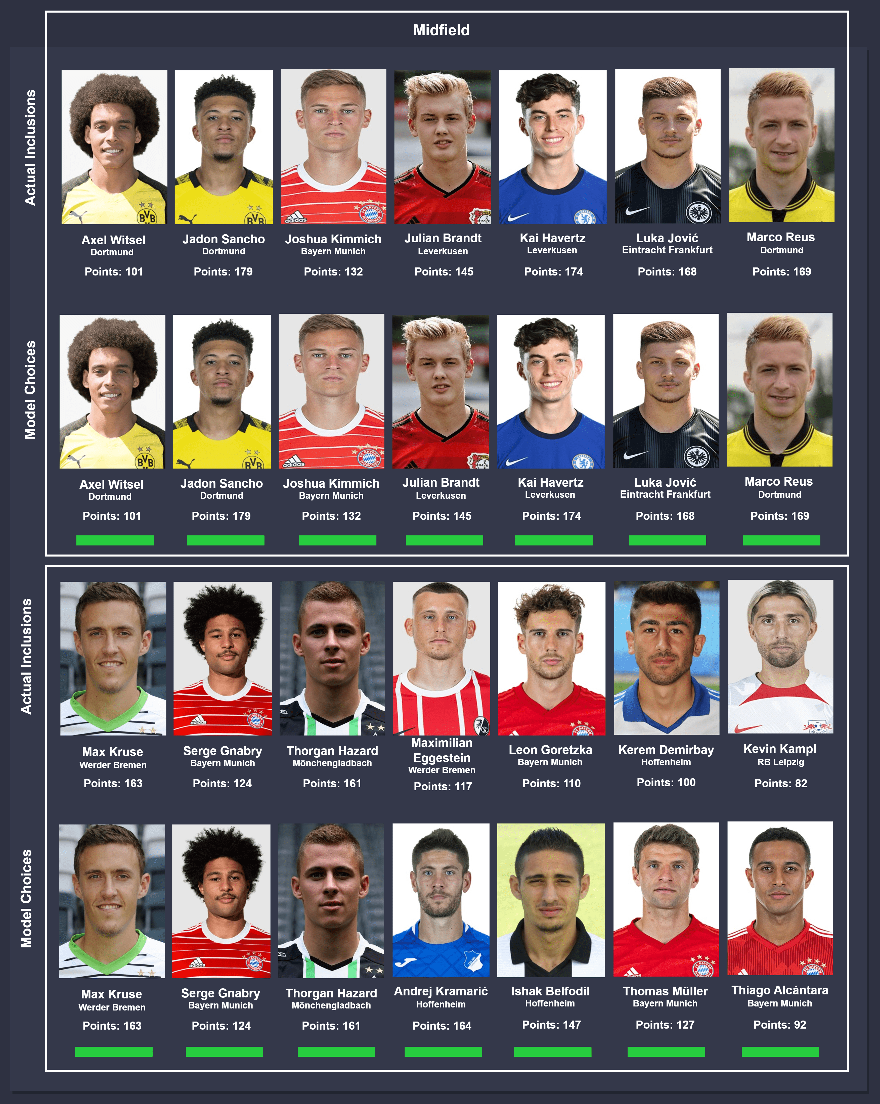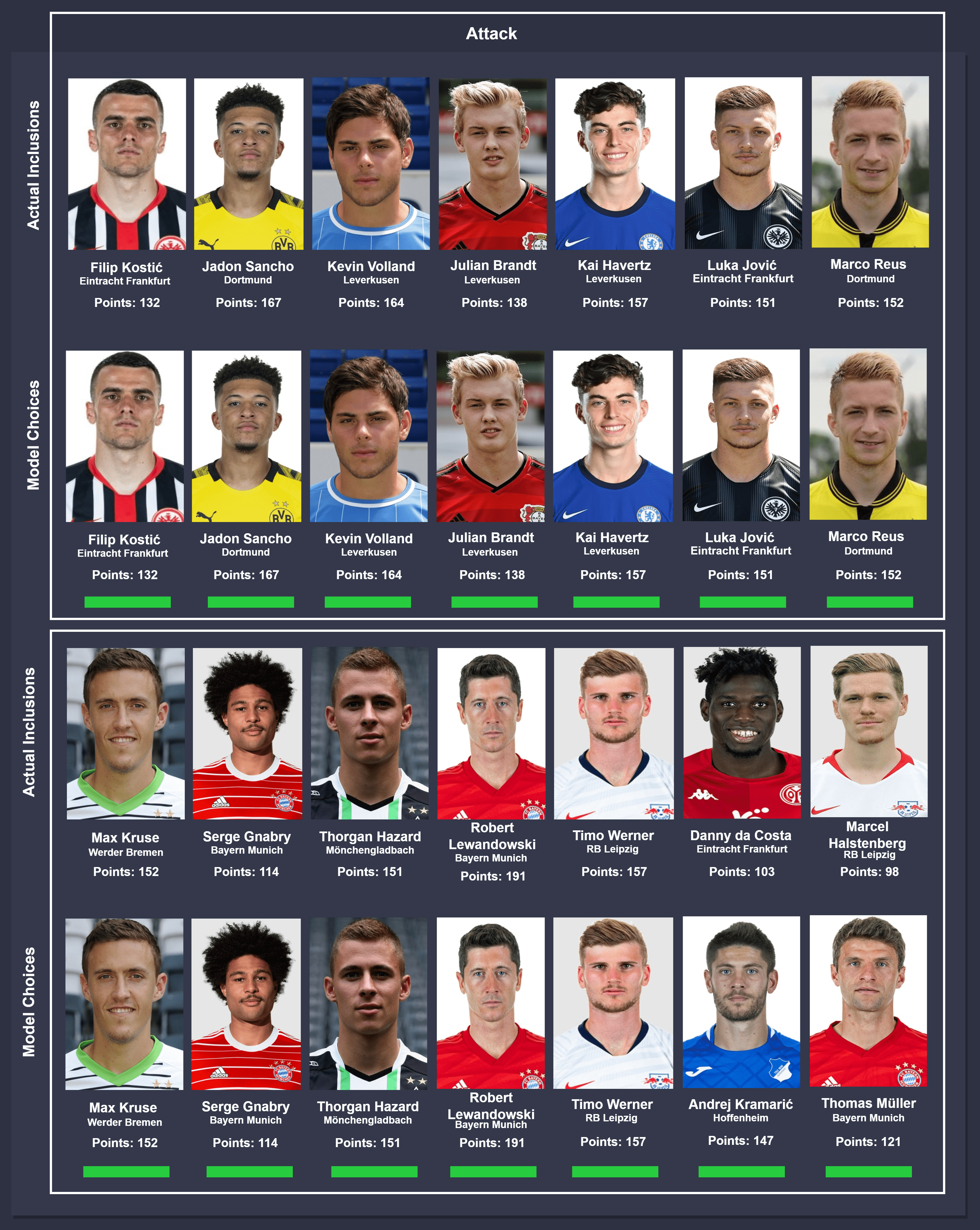 Comparison takes place between actual inclusions (top) and model choices (bottom), from left to right. In instances where different players were chosen by the model, the players were ordered on the descending order of points accumulated for consistency. The key below can be used to identify the status of the comparison.